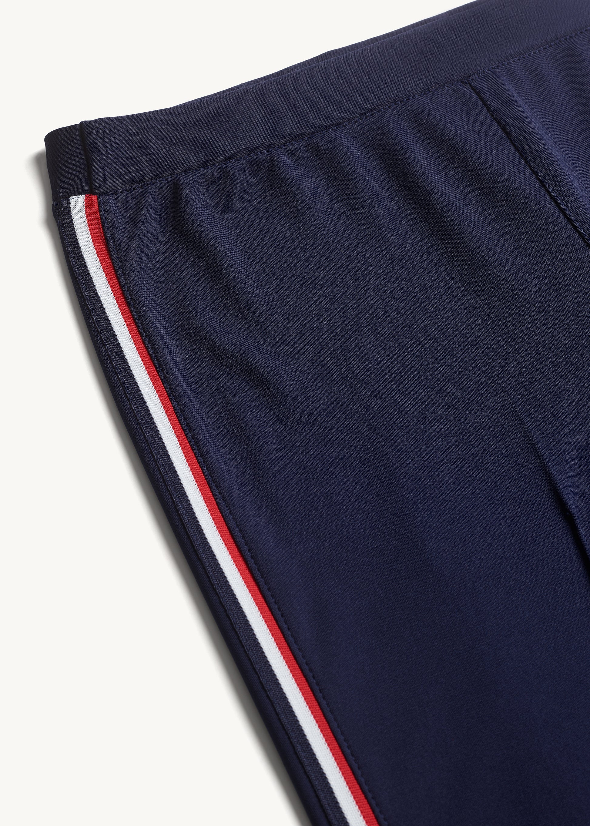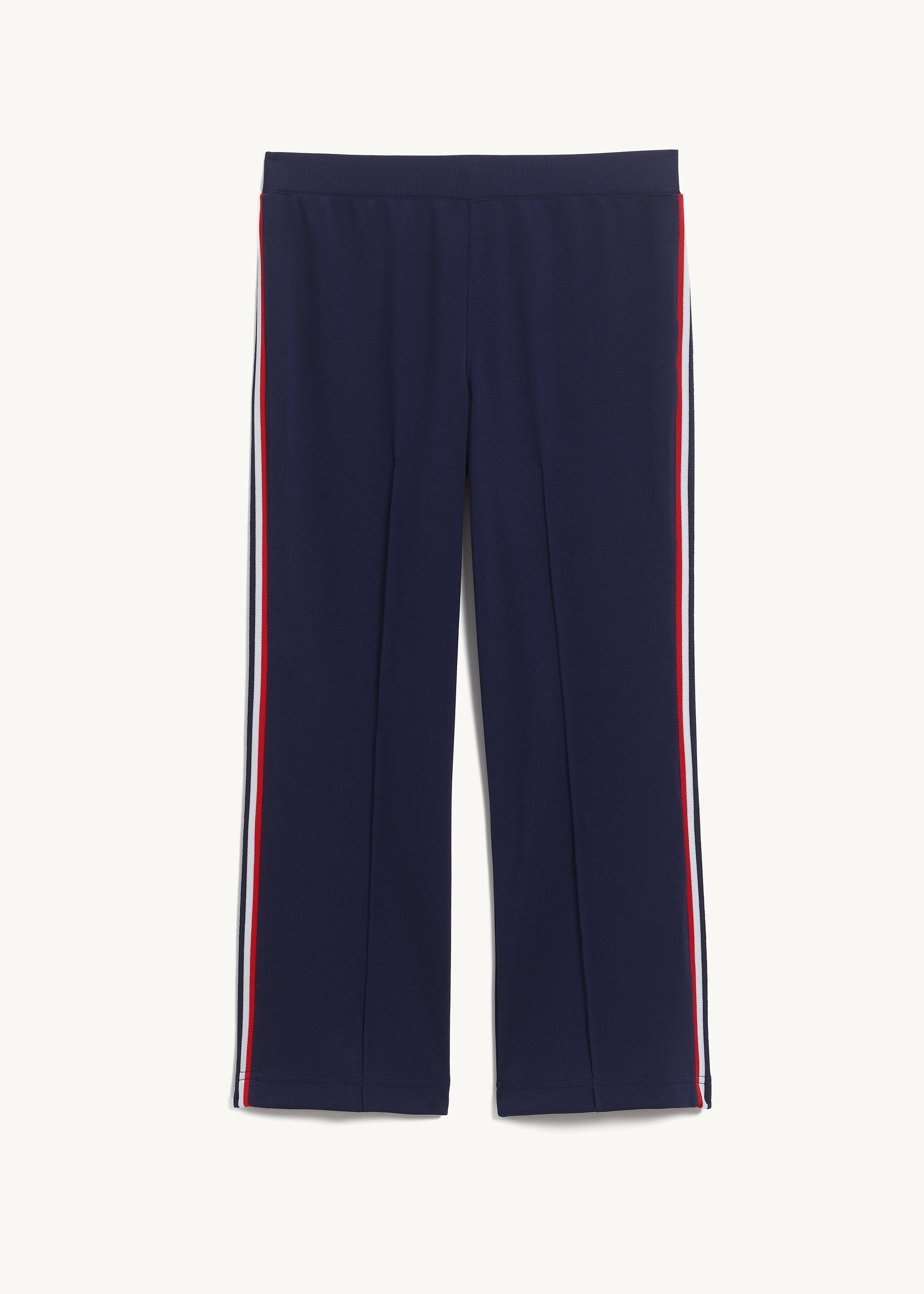 On the outside, Billie is a woven construction durable for sport abrasion and on the inside, she has a luxurious, soft feel with unmatched moisture management. The combination of polyester and microfiber is perfect for this warm-up style pant but sharp enough to wear outside sports. Elastic waist, light stretch, cropped, and glory stripes {red, white, and blue} down the outside seam. Wash in cold water and hang to dry.