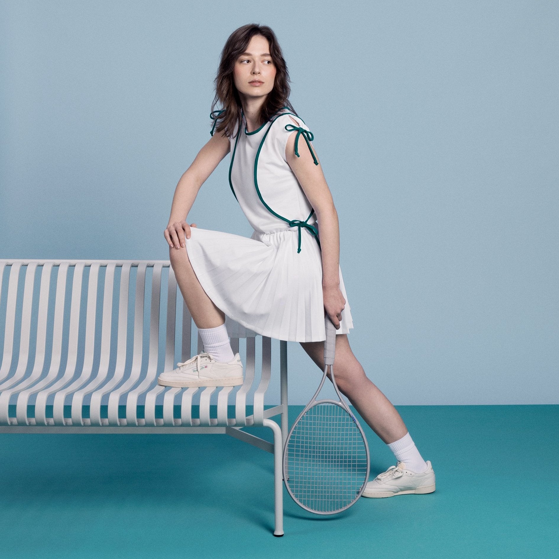 More swing in her shoulders and skirt. Made for all racquet sports.