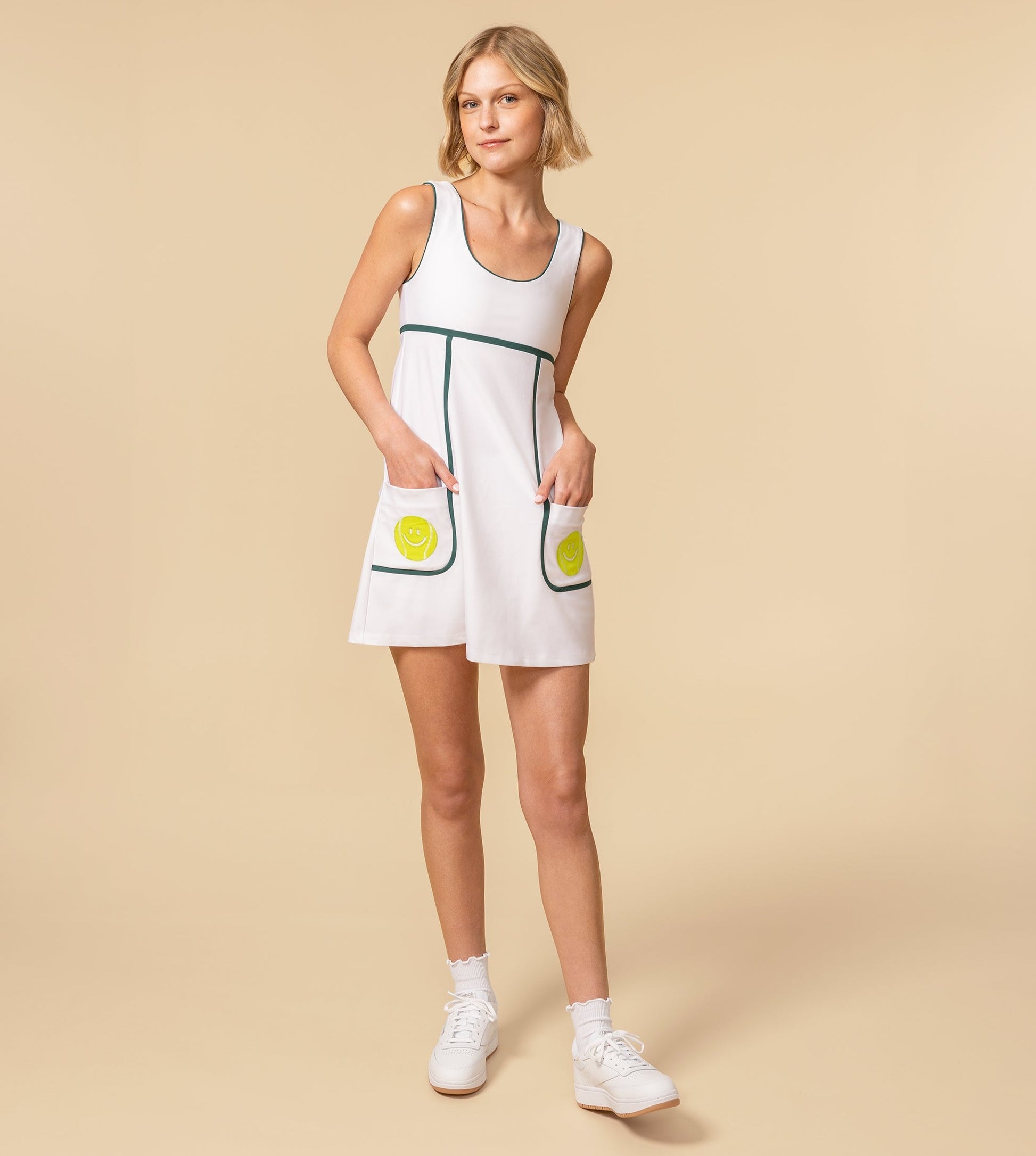 My childhood nickname is all grown up. Empire waist and A-line skirt with style lines to shape the pockets. Playful embroidered appliqué tennis balls on pockets. Smiles all around.